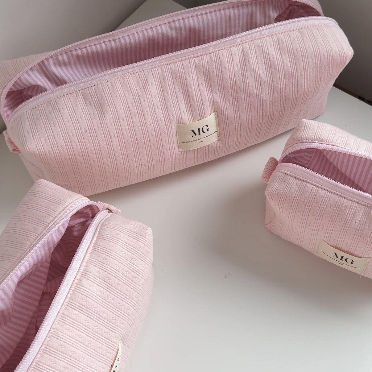 Pojemna kosmetyczka wykonana z miękkiej ażurowej bawełny oraz popeliny w paski.