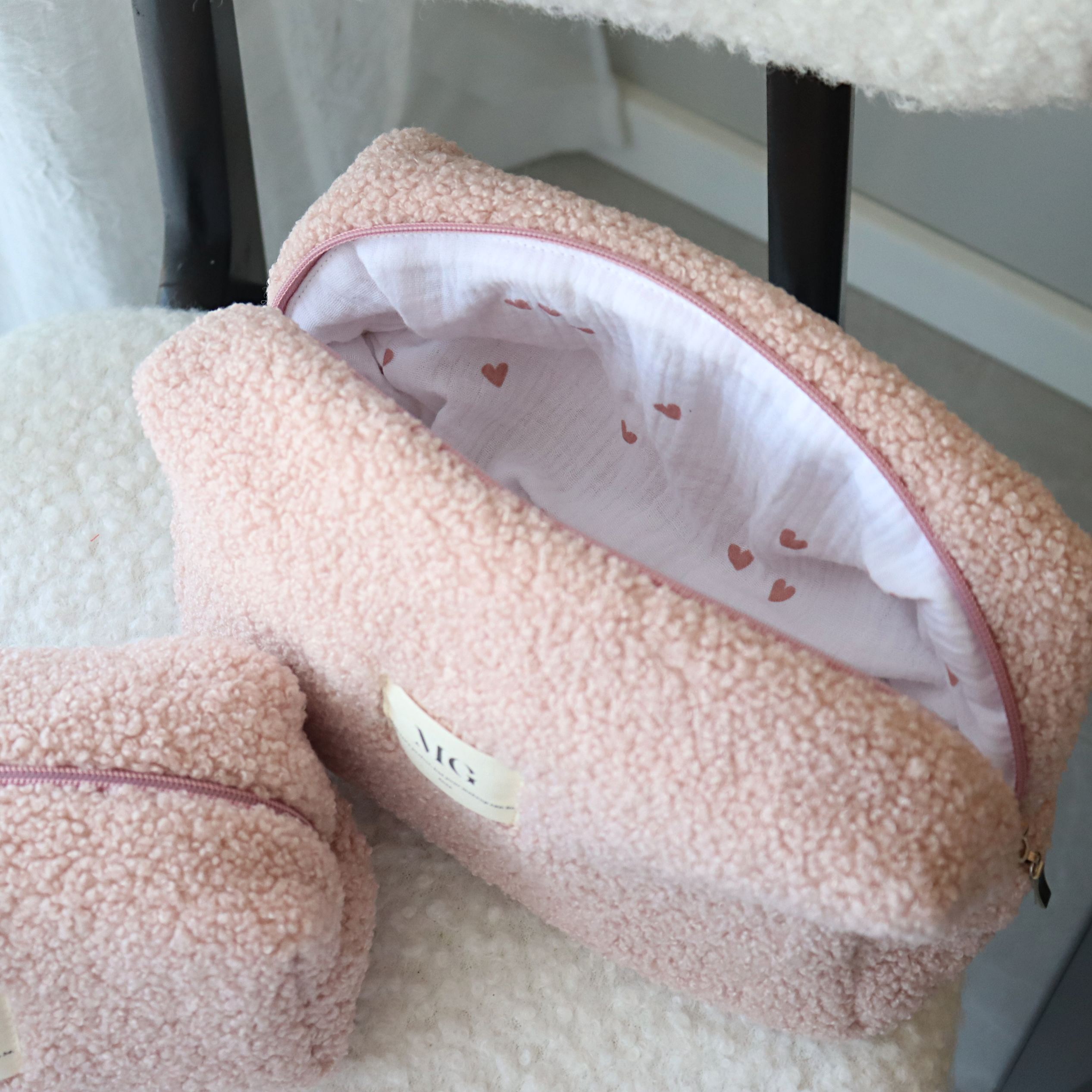 Pojemna kosmetyczka wykonana z miękkiej tkaniny baranka oraz miękkiego bawełnianego muślinu w serduszka.