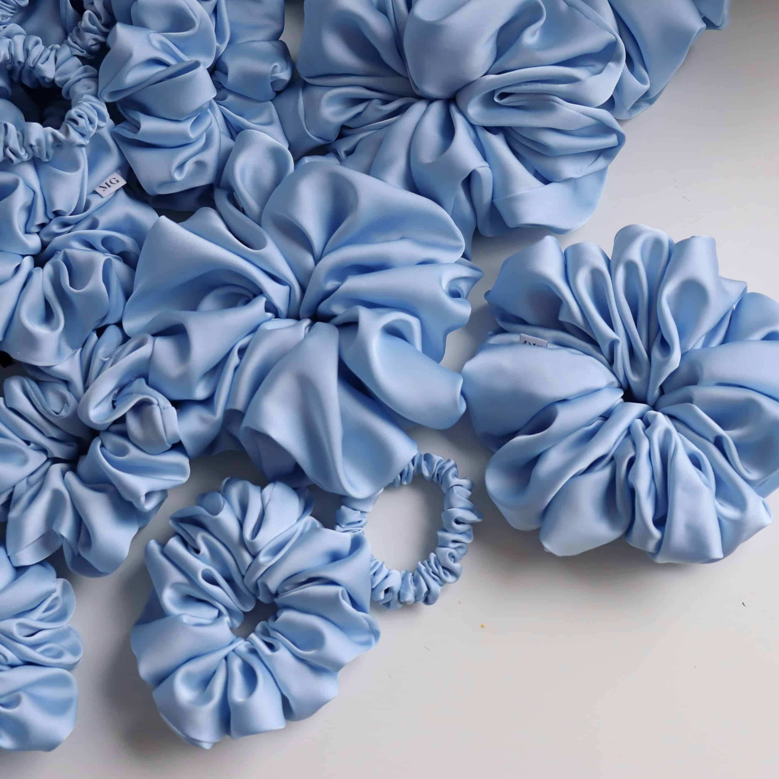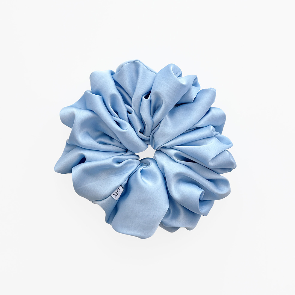 Niebieska ogromna satynowa scrunchie szyta ręcznie z najwyższej jakości jedwabistej satyny, która charakteryzuje się niezwykłą delikatnością. Gumka do włosów scrunchie posiada pozytywny wpływ na włosy, nie szarpie ich, ani nie odciska, jednocześnie dobrze je utrzymując.