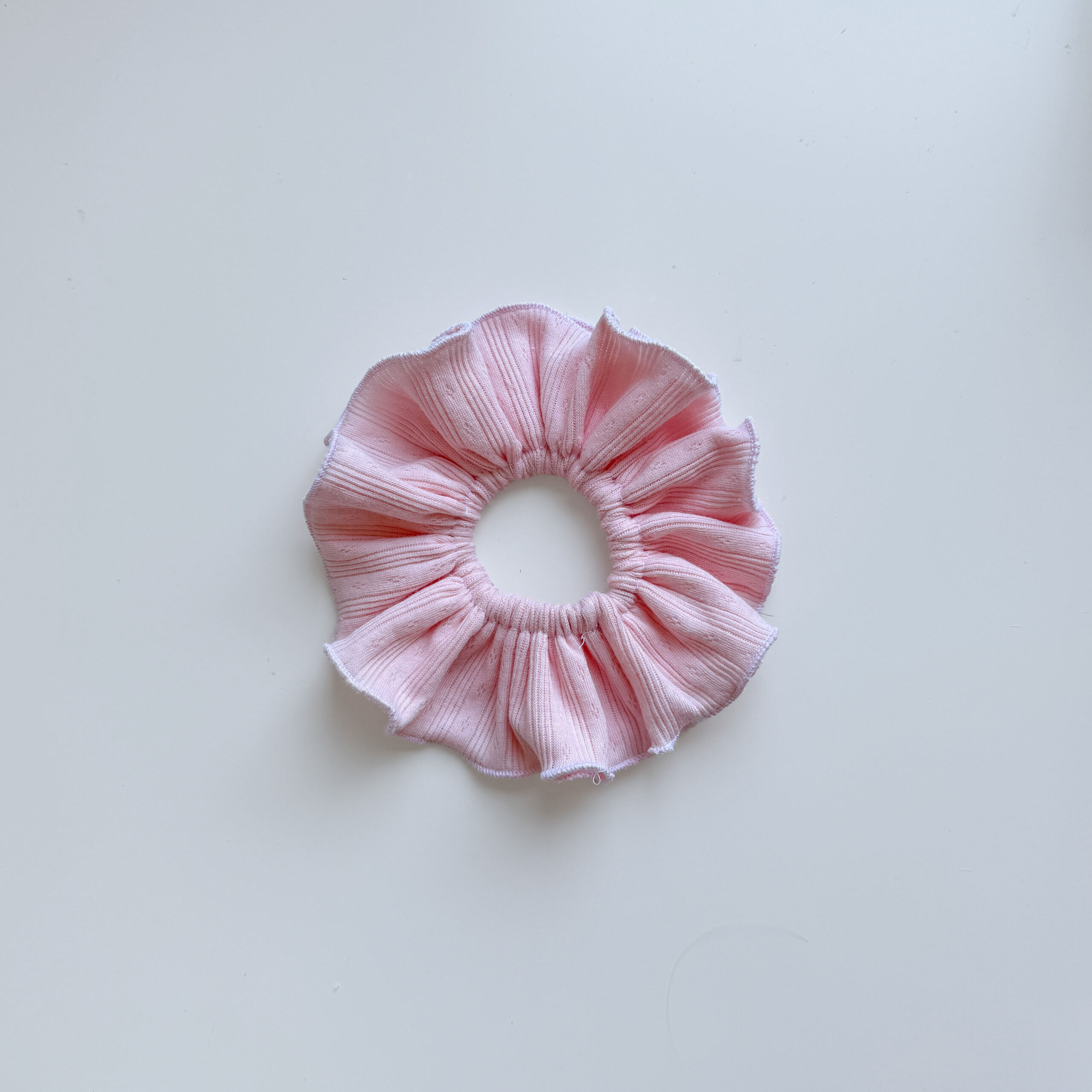 Scrunchie z falbanką wykonana z miękkiej ażurowej bawełny, posiada białe obszycie na krawędziach tworzące falbankę.