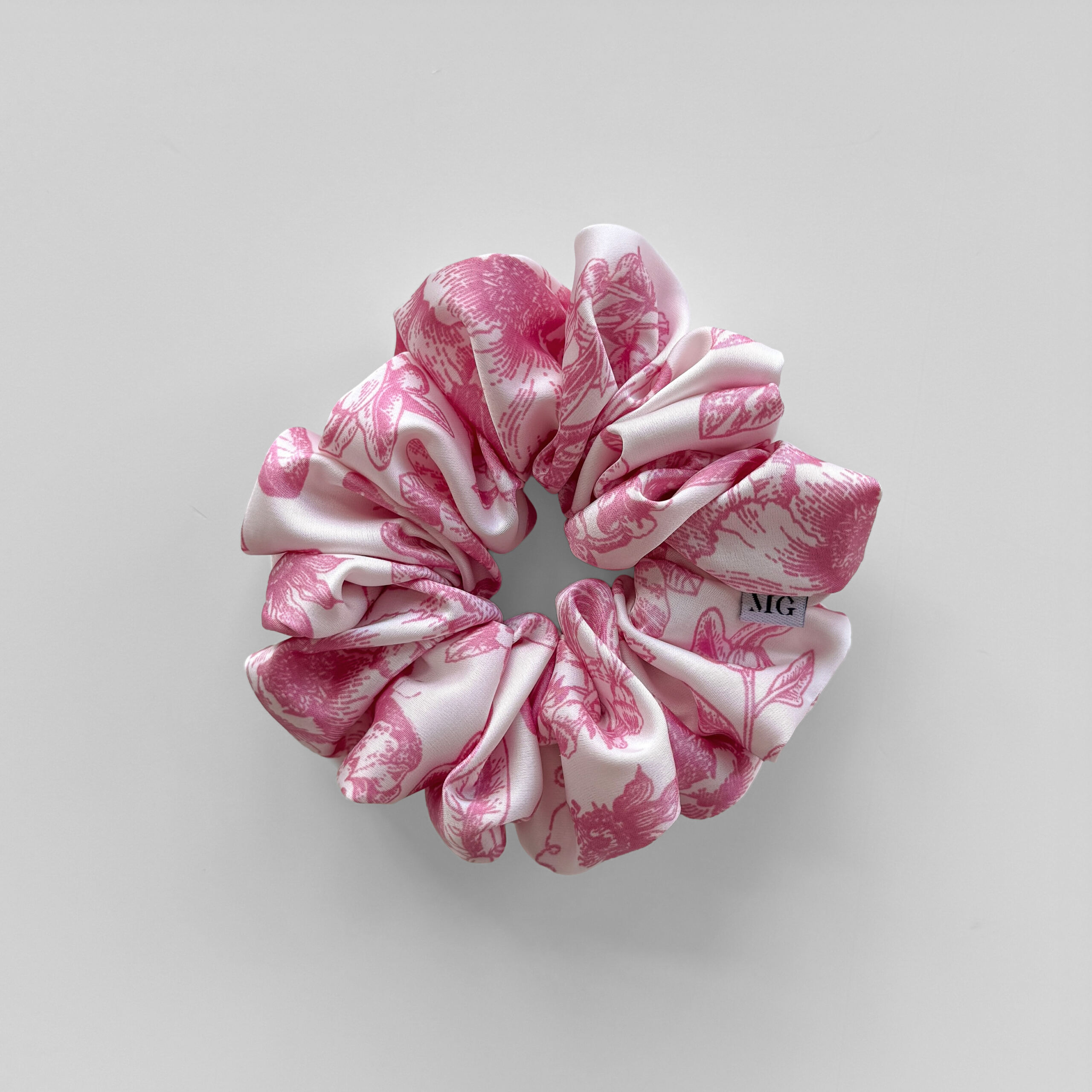 Scrunchie jest we wzór różowych kwiatów na kremowym tle.
