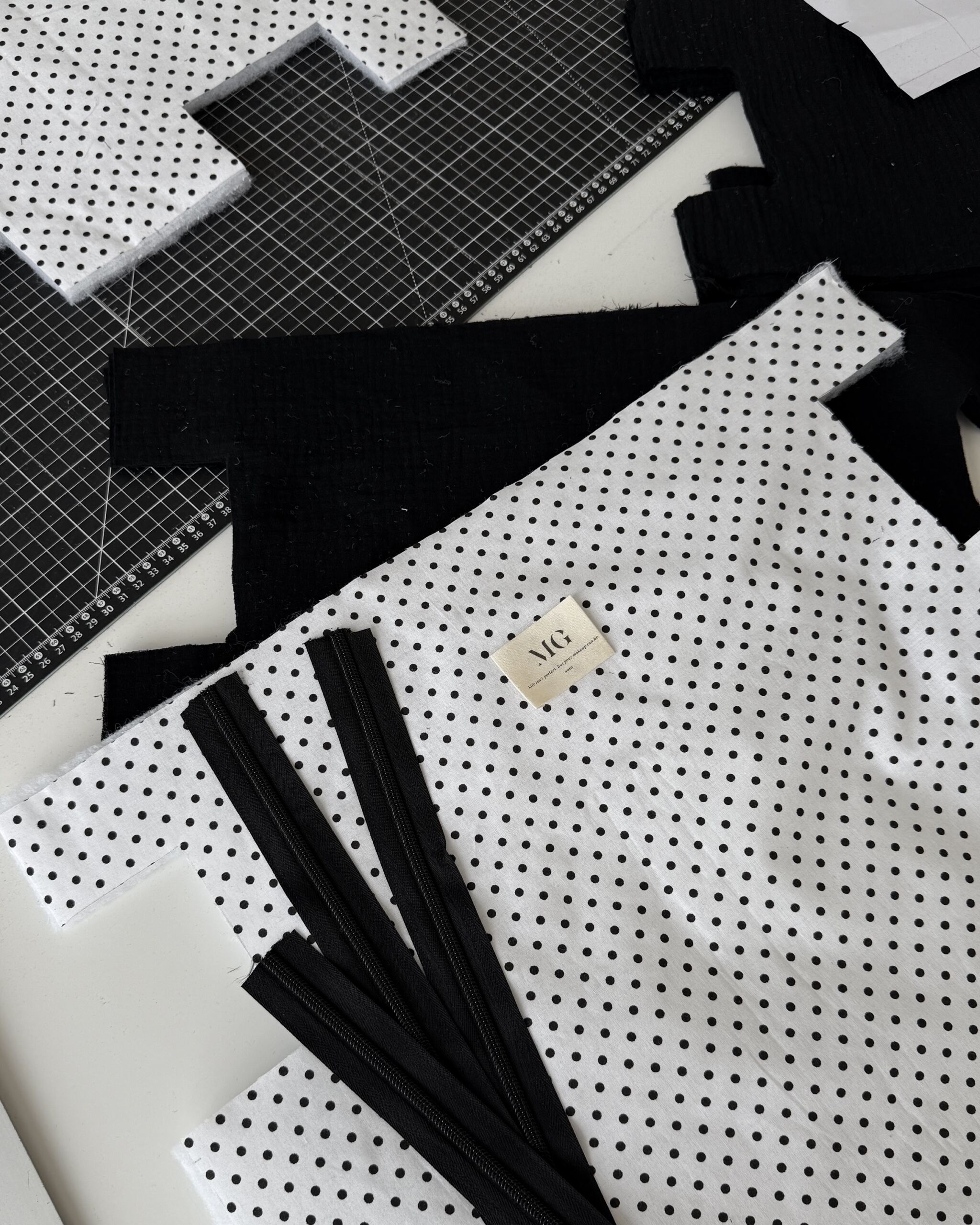 Wykonana bawełny w groszki oraz kontrastującego czarnego muślinu.